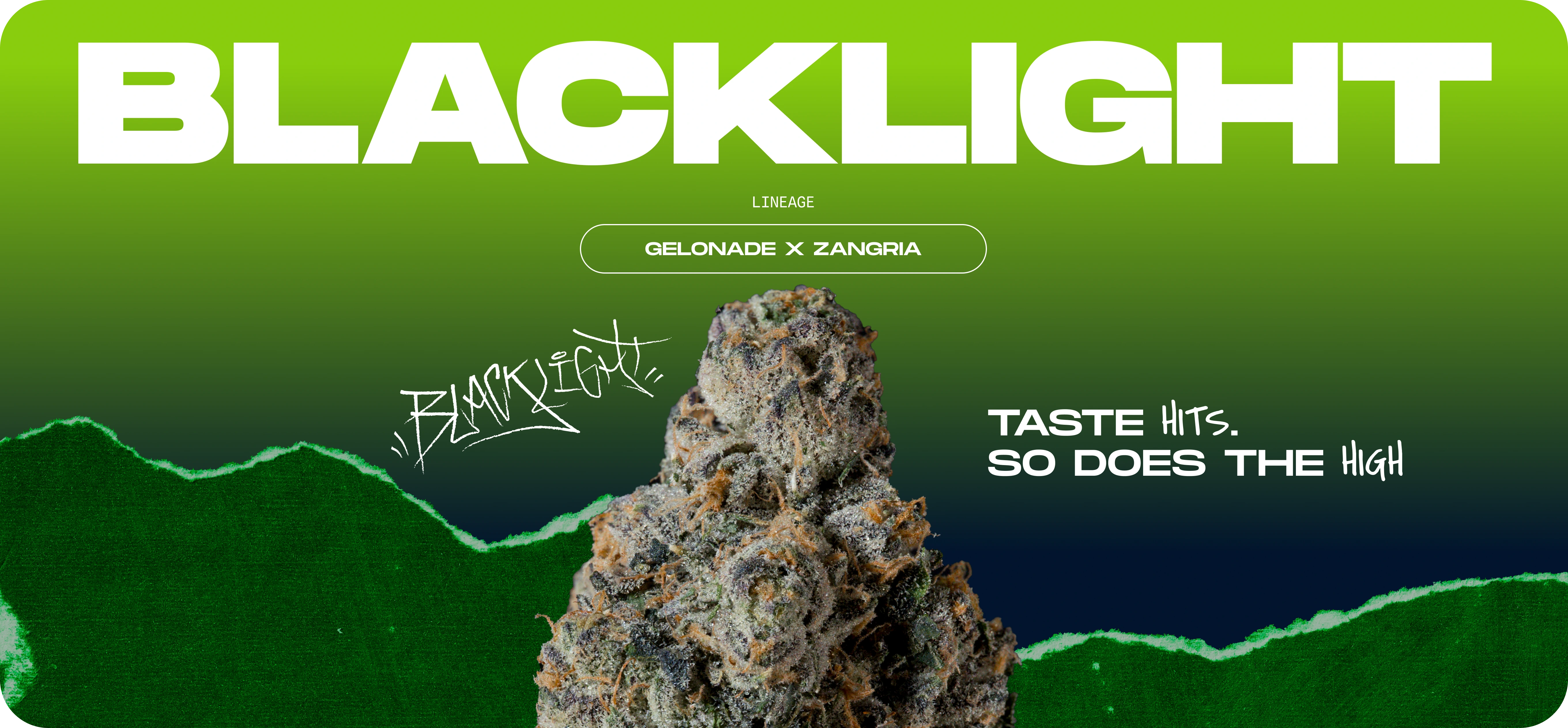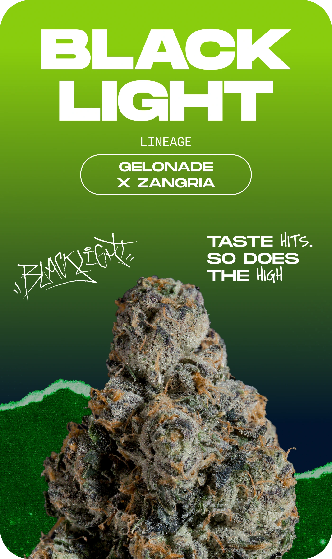 Blacklight brings two of our top in-house hybrids together. Limelight and Blackmagic and levels up what citrus gas can be. It’s one of the most potent lime-forward strains we’ve touched, but it’s not your typical candy lime. The Blackmagic adds weight, depth, and serious gas that sits up front, while the lime hits as a sharp, clean undertone. Resin’s there. Potency’s up. High is energetic but heavy. If you’re chasing next-gen citrus with actual power behind it, this is the one.